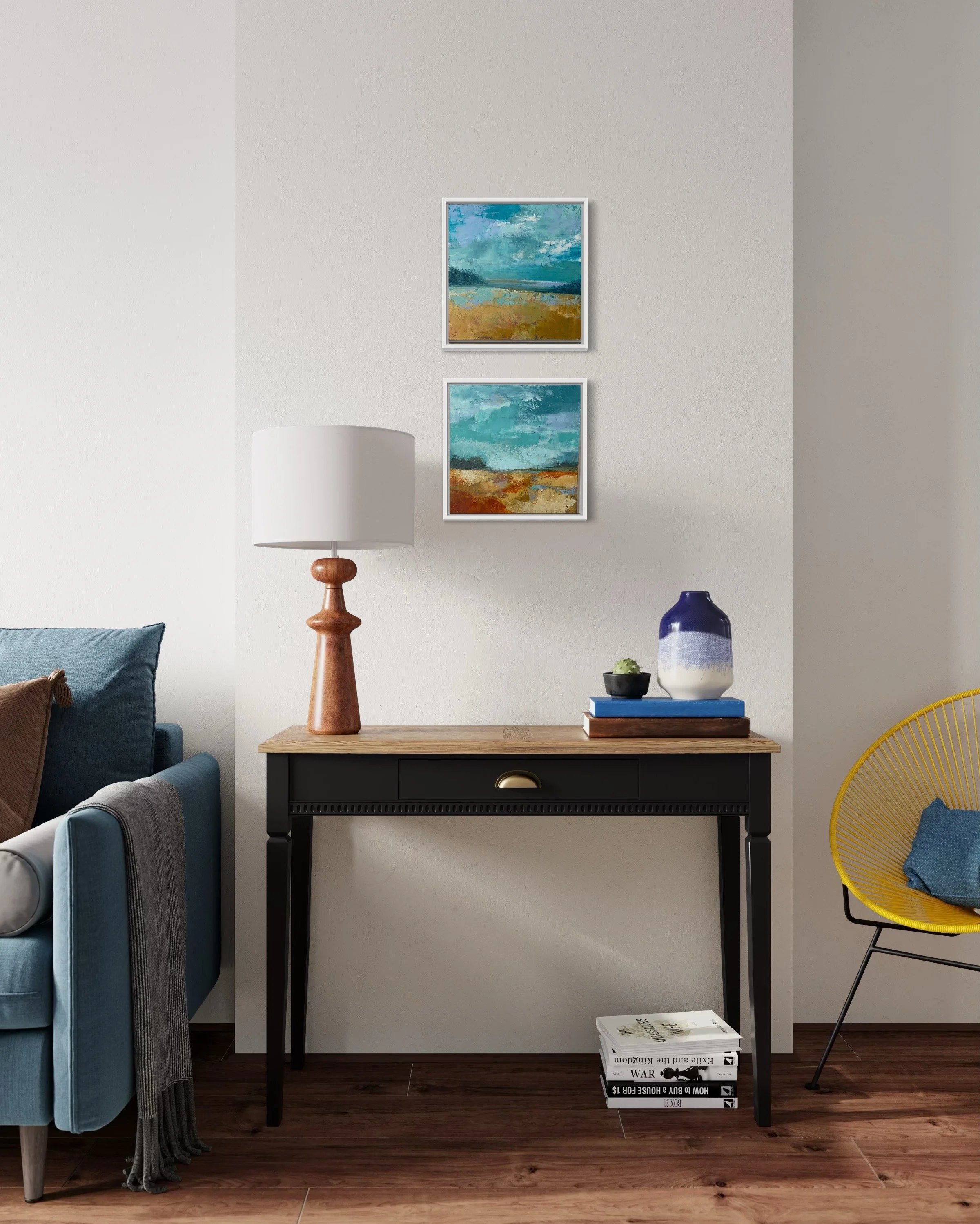 One of three paintings in the same colour palette with strawberry red abstract flowers on a windy hillside. This one is set in a St. Ives white frame.
